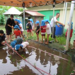 「ぬるぬるする~」と水や泥の感触を楽しみながら、稲を育てる田んぼを自分たちで作りました。