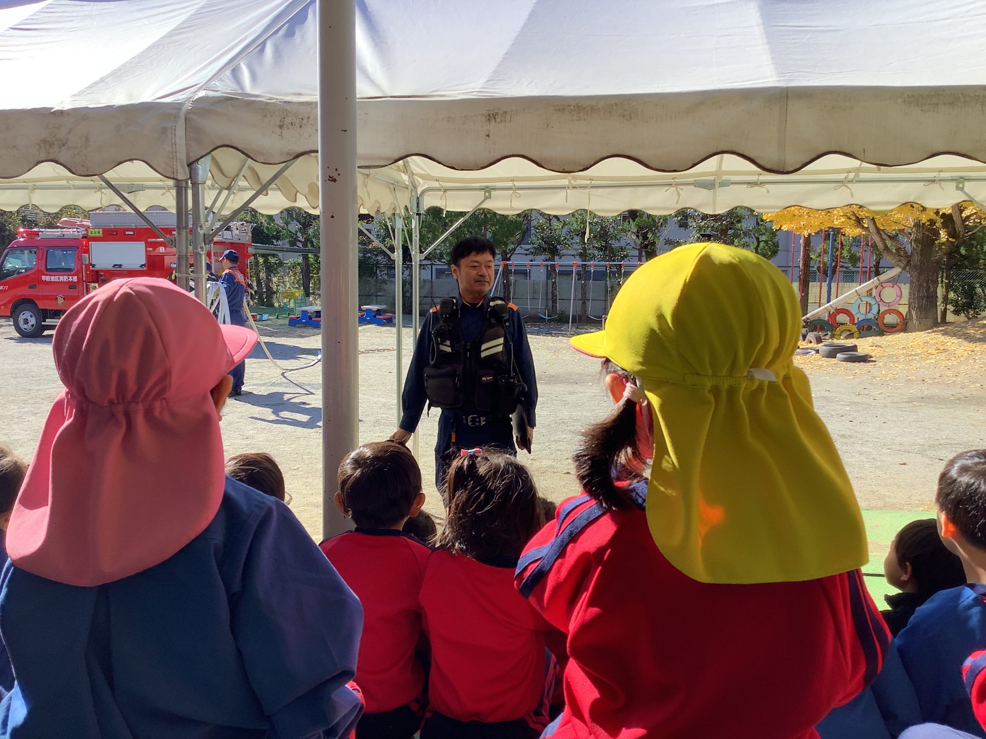 子どもたちは園庭に避難した後、職員による消火訓練を見学し、その後は消防署の方々から火事の時のお約束についてお話をしていただきました。