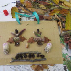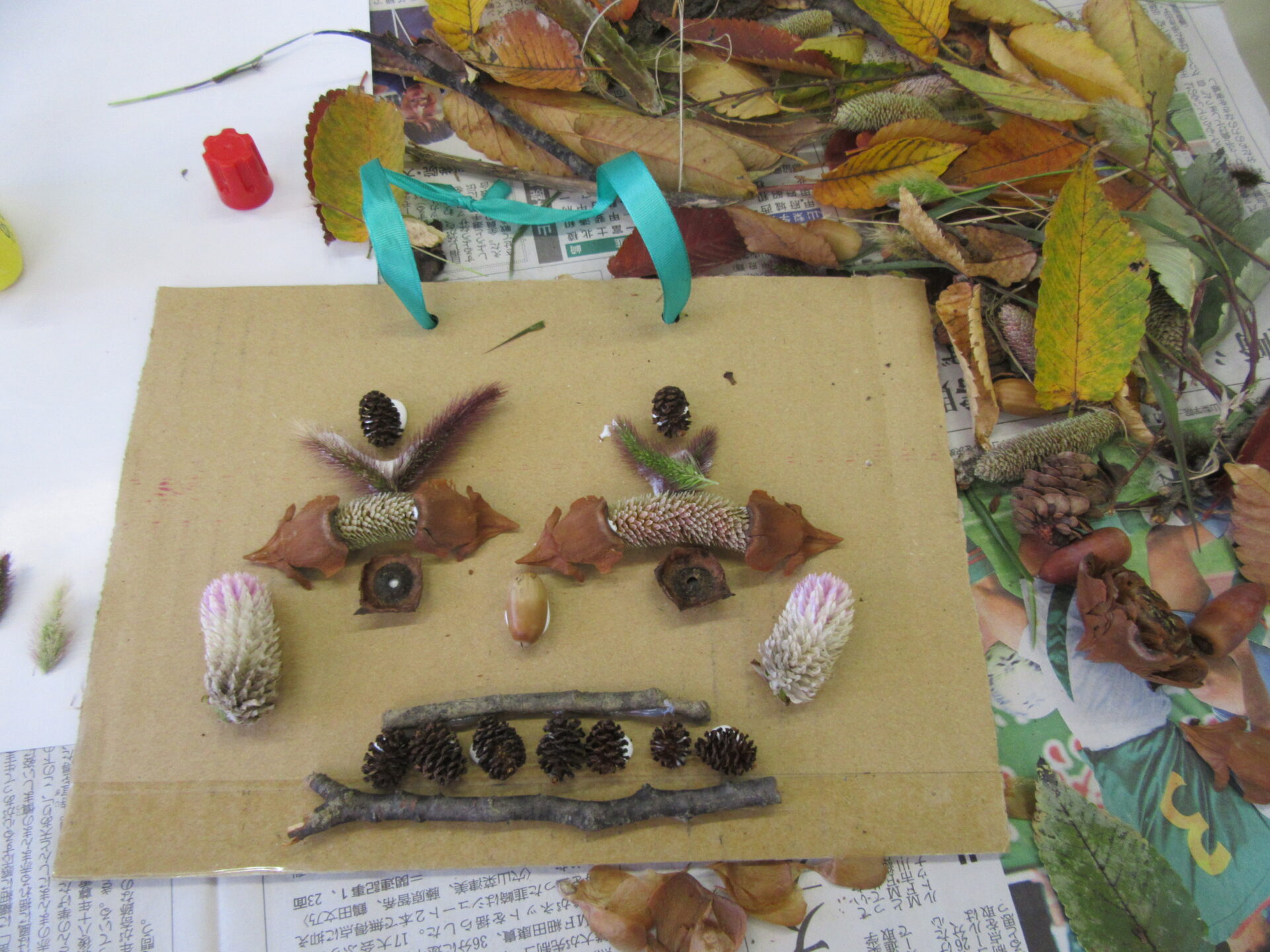 また、校庭にある葉っぱや木の枝、木の実など、身近な自然物を使った『アートボード作り』に挑戦!