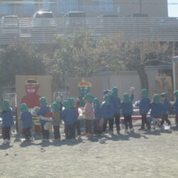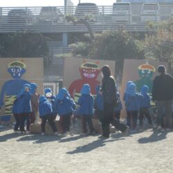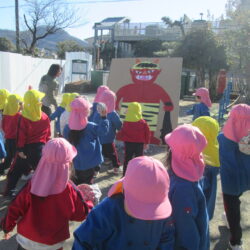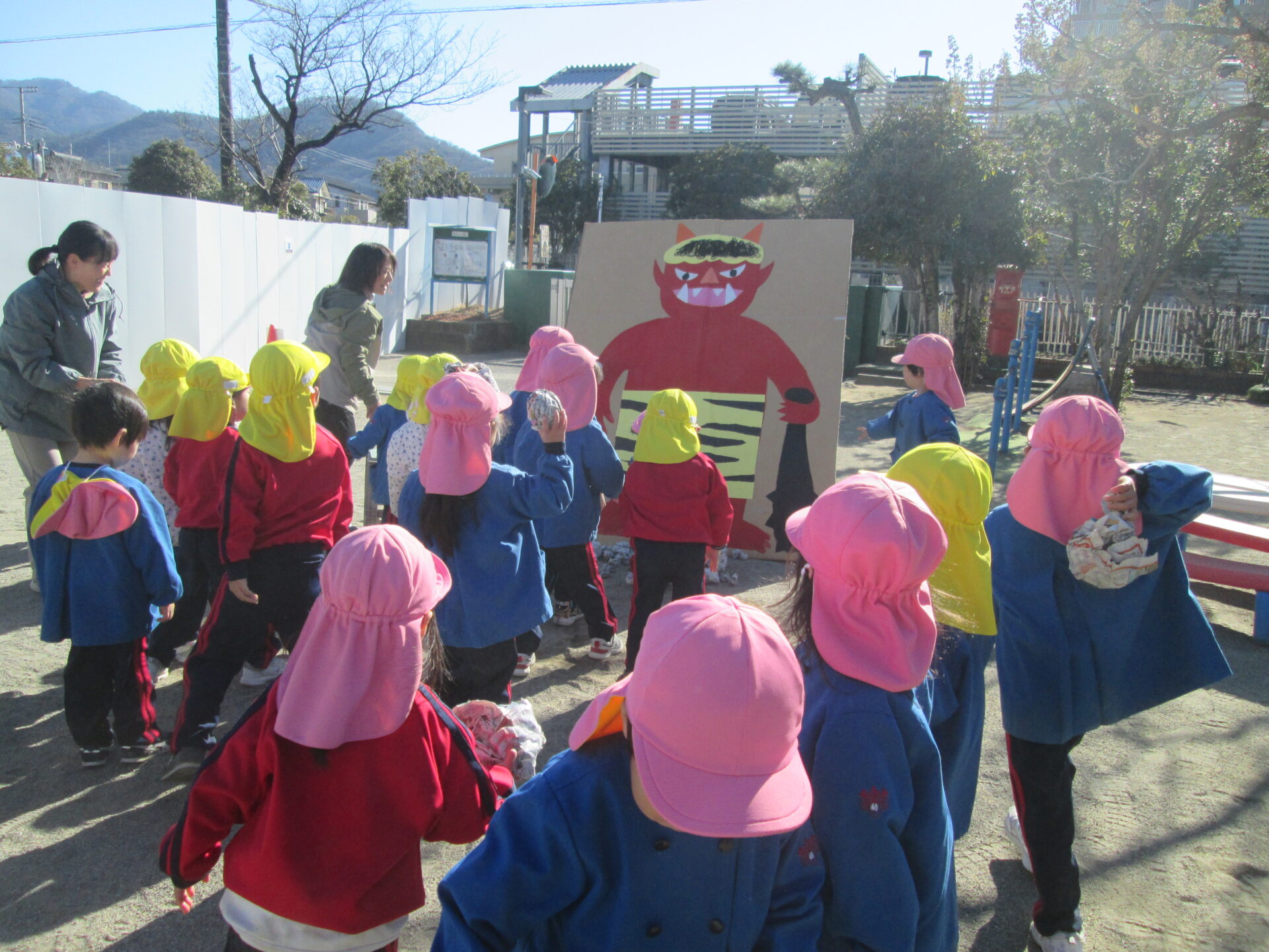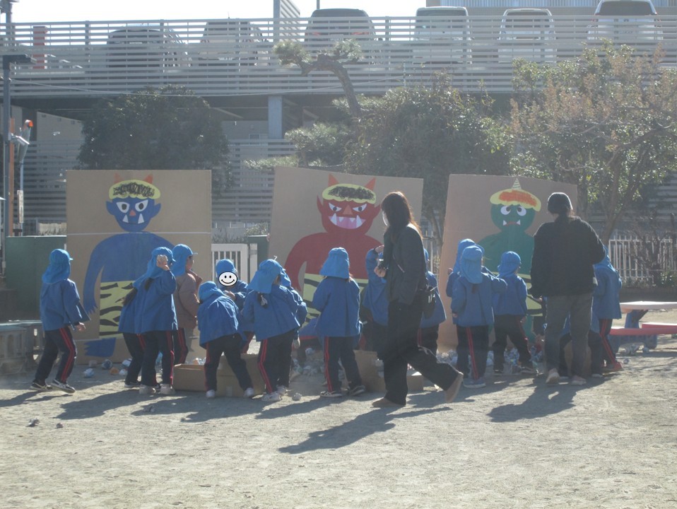 さくらぐみでは、クラスのチームで豆を作り、自分たちで作った豆を3体の鬼に向かって投げました。鬼を退治して、元気に過ごせますように。