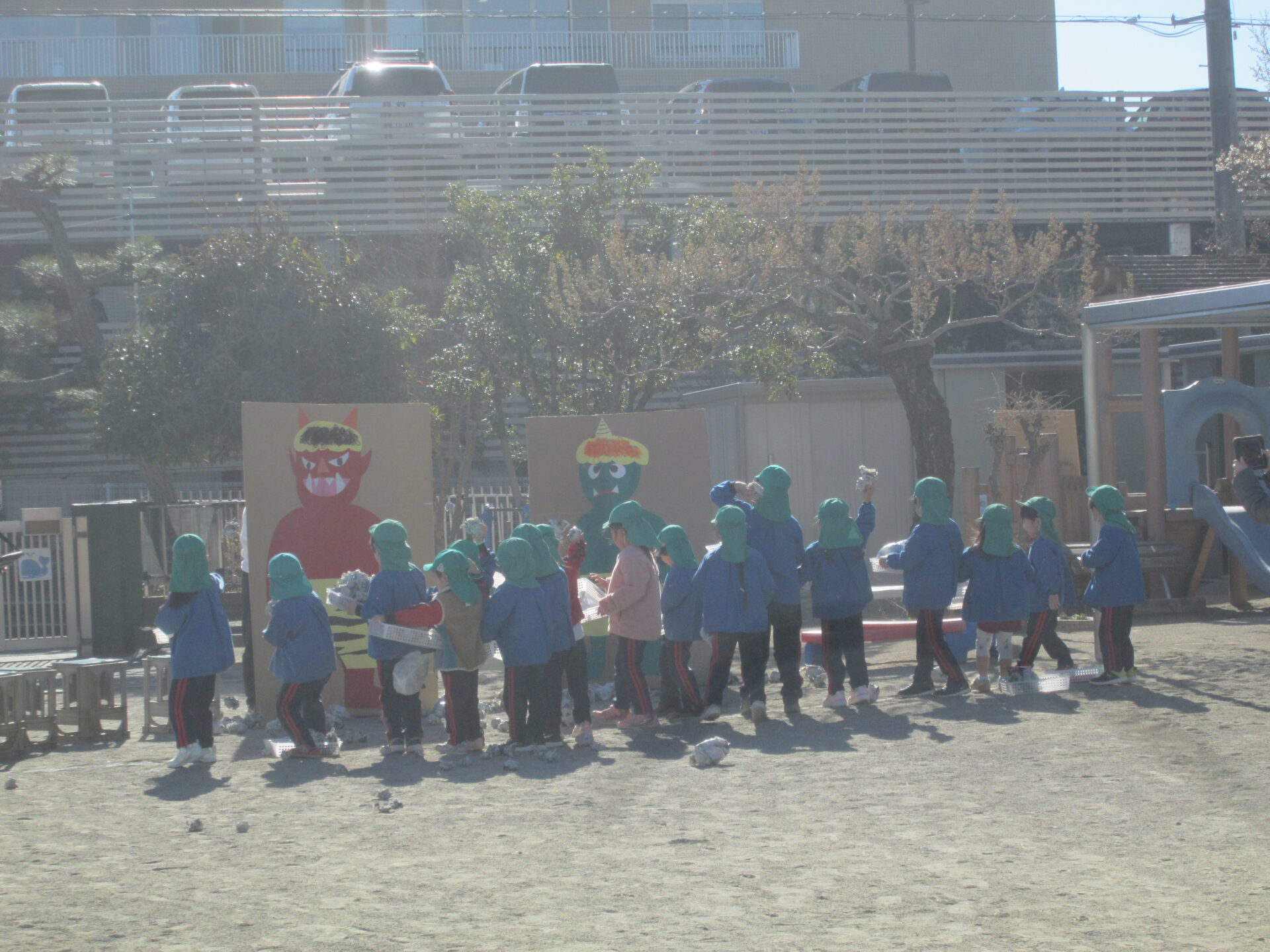 ひまわりぐみでは、1人1カゴ分ほど作った豆を、両手に持ち、張り切って大きな2体の鬼めがけて投げました。
